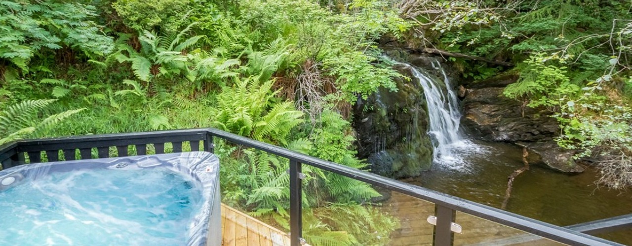 An idyllic holiday home next to the stunning Loch Tay in Scotland, this luxury hot tub lodge with sauna overlooks a natural waterfall with south-facing views across to the Ben Lawers mountain range for the ultimate in relaxing experiences.